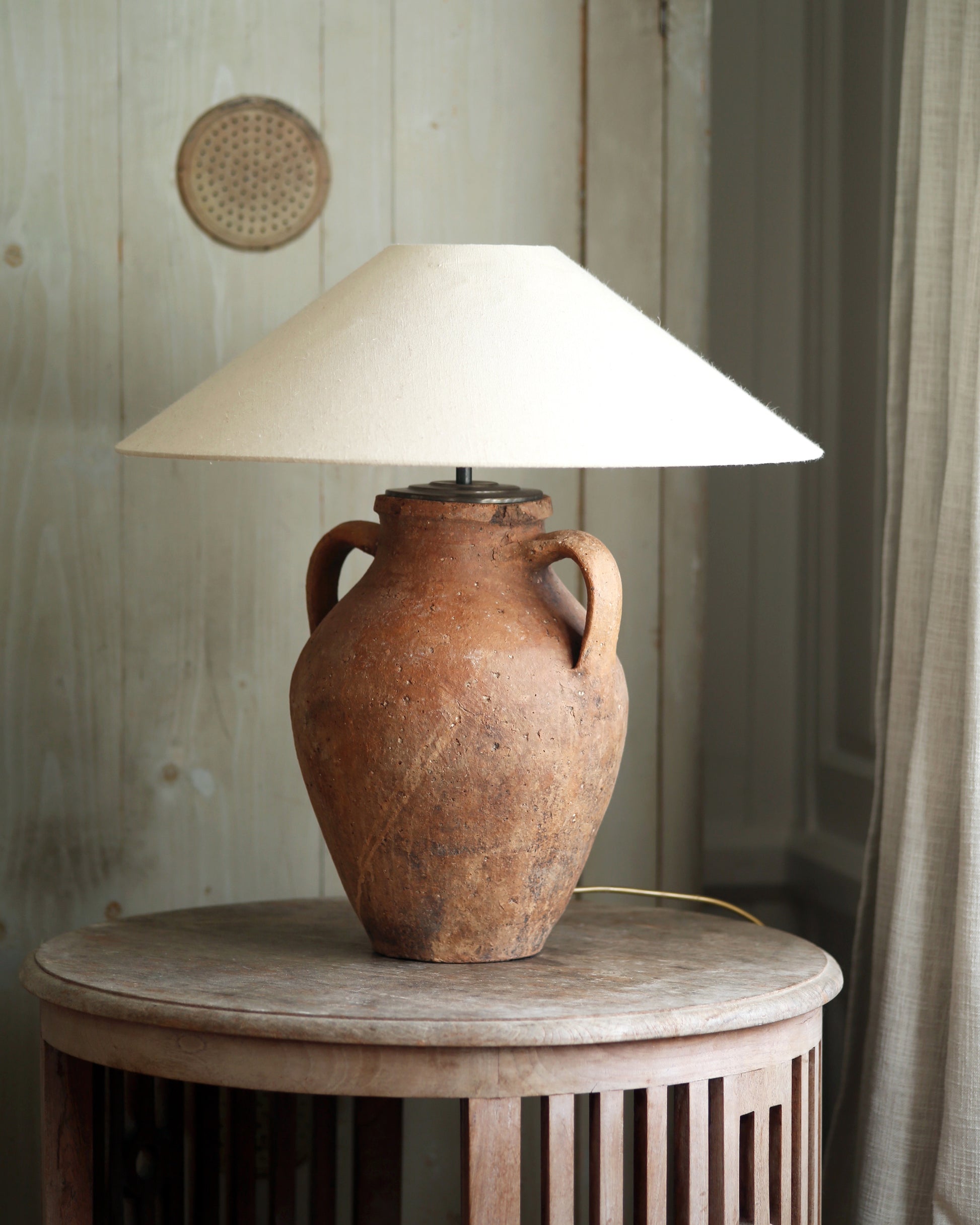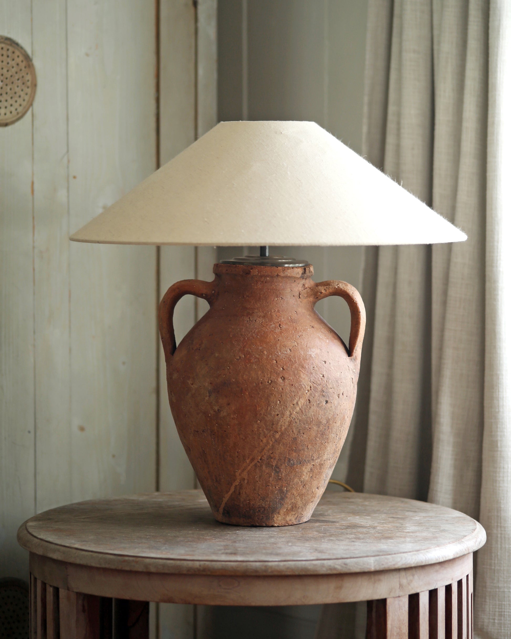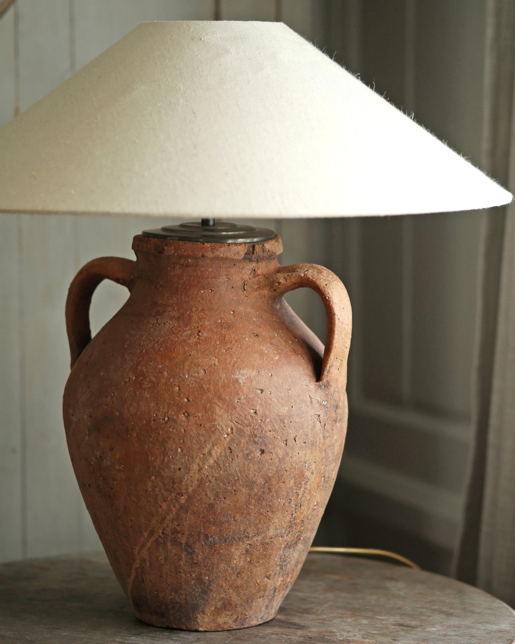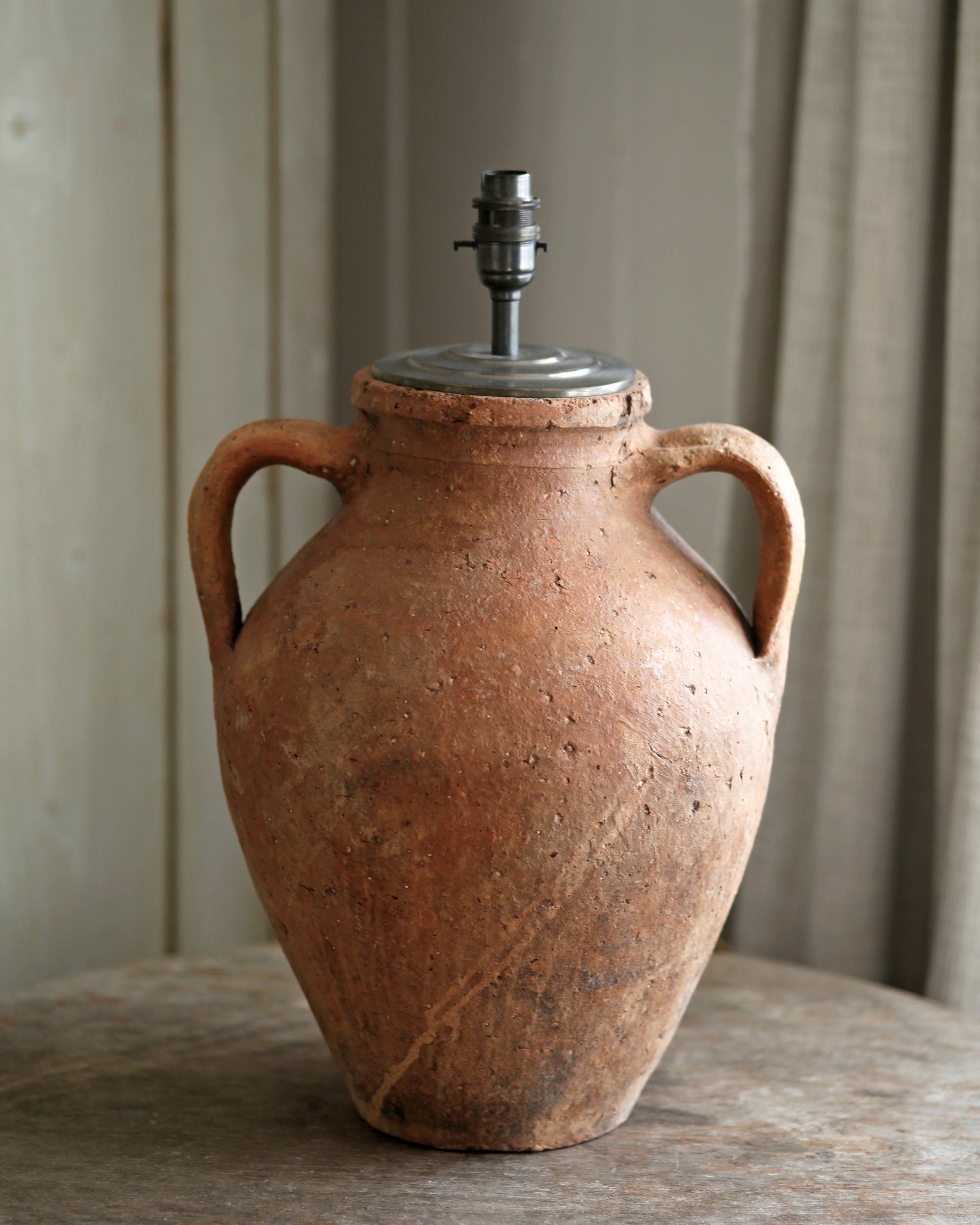A rustic unglazed terracotta pot repurposed to a distinctly unique, statement antique table lamp.